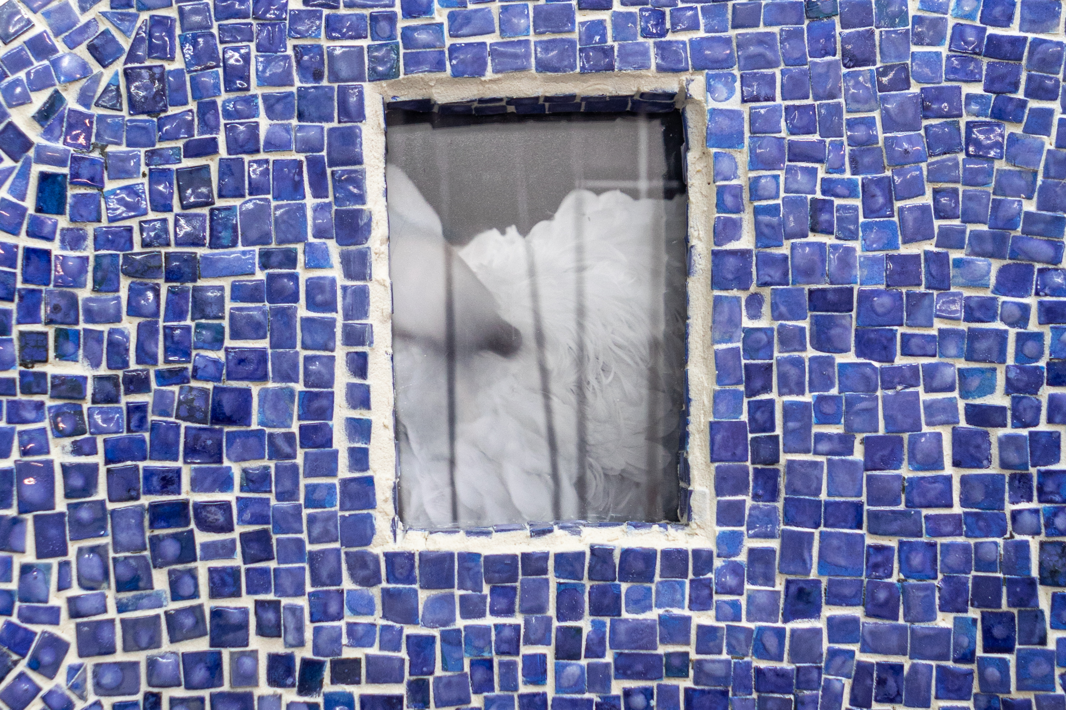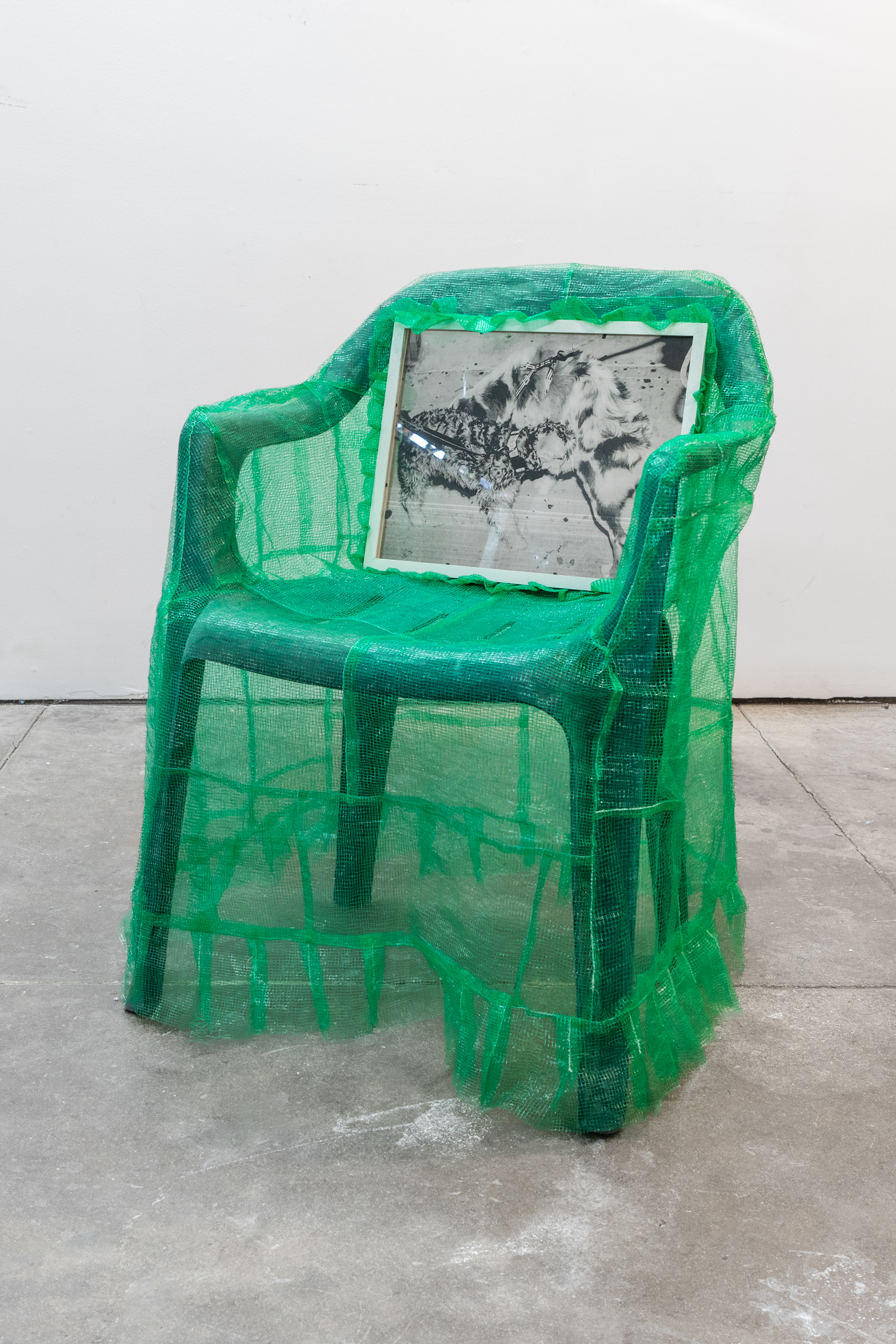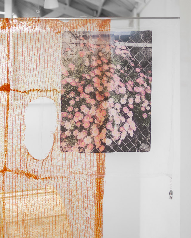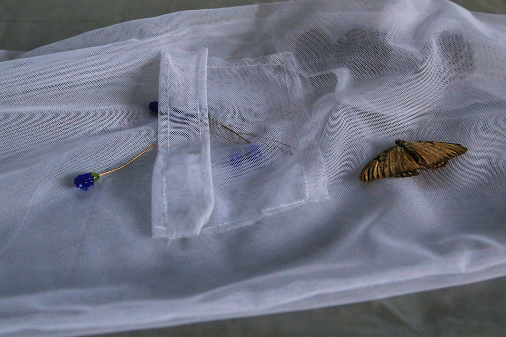Dead bees, ceramic, fruit and vegetable bags, image transfer, steel, glass
